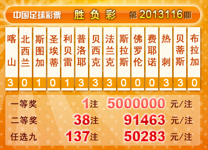 �����й������Ʊ��13116�ڿ���������һ�Ƚ� 1 ע��ÿע 5,000,000Ԫ������ 3,109,755Ԫ�����Ƚ� 38 ע��ÿע 91,463 Ԫ���������� 18,102,132 Ԫ����ѡ9������������һ�Ƚ� 137 ע��ÿע 50,283 Ԫ���������� 10,763,790 Ԫ��