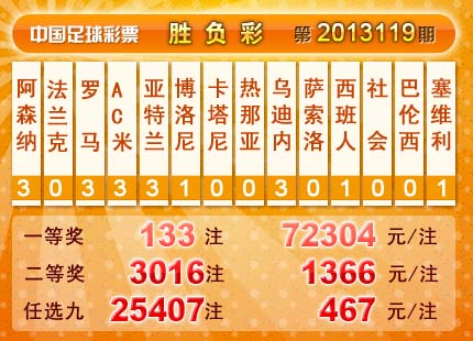 �����й������Ʊ��13119�ڿ���������һ�Ƚ� 133ע��ÿע72304Ԫ�����Ƚ�3016 ע��ÿע1366 Ԫ����������21,465,480Ԫ����ѡ9������������һ�Ƚ�25407 ע��ÿע467 Ԫ���������� 18,542,744 Ԫ��