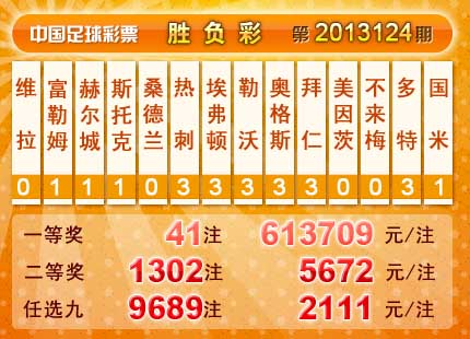 �����й������Ʊ��13124�ڿ���������һ�Ƚ� 41 ע��ÿע 613,709 Ԫ�����Ƚ� 1302 ע��ÿע 5,672 Ԫ����������38,468,820Ԫ����ѡ9������������һ�Ƚ� 9689 ע��ÿע 2,111 Ԫ����������27,269,940Ԫ��
