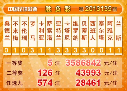 ���� ��������ʱ��2013��9��30�գ����ʤ����13135���ڽ���ȫ��������Ӣ�������������ֿͳ�սʤɣ����������У����ͳ�սƽ�������������ʤ���¼ױ���������÷��Ŧ�ױ���ս�ɺͣ�˹ͼ���ش�ʤ������ˣ������У�����˹սʤ���������Ƕ�������Ħ�ɸ�ͳ�����˹��ƽ�� �����й������Ʊ��13135�ڿ���������һ�Ƚ� 5ע��ÿע3,586,842Ԫ�����Ƚ�126ע��ÿע43,993Ԫ����������28,871,008Ԫ����ѡ9������������һ�Ƚ�574ע��ÿע28,461Ԫ����������20,838,262Ԫ�� �������ʤƽ���ʹ��� ʤ ɣ �� �� �� �� �� �� �� ά �� �� �� �� �� һ�Ƚ��� 5(ע) 3,586,842(Ԫ/ע) ���Ƚ��� 126(ע) 43,993(Ԫ/ע) �ξŽ�����574(ע) 28,461(Ԫ/ע)