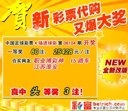 �����й������Ʊ4��������Ϸ��08104�ڿ���������һ�Ƚ�60ע��ÿע����25428Ԫ��ȫ����������2383946Ԫ��