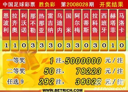 �����й������Ʊʤ���ʵ�08028�ڿ���������һ�Ƚ�1ע��ÿע����5000000Ԫ�����Ƚ�50ע��ÿע78223Ԫ������ʤ��������Ϊ��20370580Ԫ��4126019.7Ԫ����Ӣ��ʤ���ʵ�08029��ͷ�����ء�