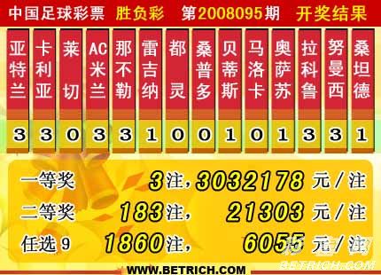 �����й������Ʊʤ���ʵ�08095�ڿ���������һ�Ƚ�3ע��ÿע3032178Ԫ�����Ƚ�183ע��ÿע21303Ԫ������ʤ����������Ϊ��20304764Ԫ��