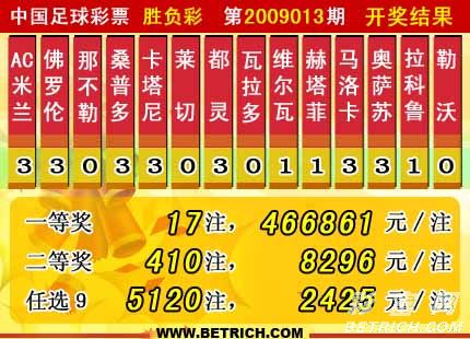 �����й������Ʊʤ���ʵ�09013�ڿ���������һ�Ƚ�17ע��ÿע466861Ԫ�����Ƚ�410ע��ÿע8296Ԫ������ʤ����������Ϊ��17715720Ԫ��