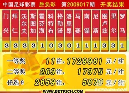 �����й������Ʊʤ���ʵ�09017�ڿ���������һ�Ƚ�11ע��ÿע1729961Ԫ�����Ƚ�269ע��ÿע17975Ԫ������ʤ����������Ϊ��25184630Ԫ������7746865Ԫ���汾��ͷ�����ء���ѡ9������������һ�Ƚ�2659ע��ÿע5870Ԫ��������ѡ�ų�������Ϊ��24392000Ԫ��