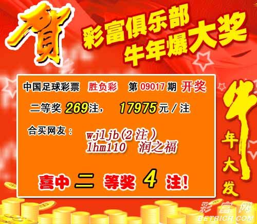 �����й������Ʊʤ���ʵ�09017�ڿ���������һ�Ƚ�11ע��ÿע1729961Ԫ�����Ƚ�269ע��ÿע17975Ԫ��
