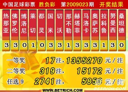 �����й������Ʊʤ���ʵ�09023�ڿ�����һ�Ƚ�17ע��ÿע����1355270Ԫ�����Ƚ�319ע��ÿע15172Ԫ������ʤ����������Ϊ��25208740Ԫ������11746078Ԫ���뱾��ͷ�����ء���ѡ�ų�������һ�Ƚ�2741ע��ÿע5853Ԫ��������ѡ�ų�������Ϊ��25069802Ԫ��