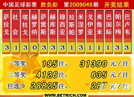 �����й������Ʊʤ���ʵ�09049�ڿ�����һ�Ƚ�195ע��ÿע31390Ԫ�����Ƚ�4126ע��ÿע635Ԫ������ʤ����������Ϊ��13663268Ԫ����ѡ9������������һ�Ƚ�28825ע��ÿע287Ԫ����ѡ�ų�������Ϊ��12930486Ԫ��