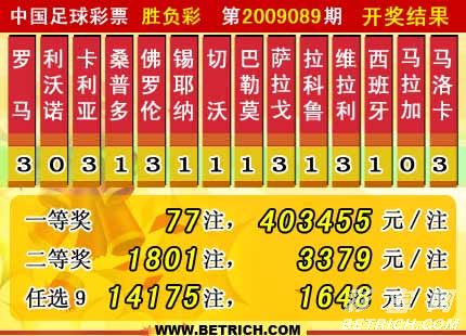 �����й������Ʊ��09089�ڿ���������һ�Ƚ�77ע��ÿע403455Ԫ�����Ƚ�1801ע��ÿע3379Ԫ����������31699266Ԫ��ʤ����09088��16864770Ԫ���뱾��ͷ�����ء���ѡ9������������һ�Ƚ�14175ע��ÿע1648Ԫ����������27147242Ԫ�������ξ�ͷ���ɽ�600��