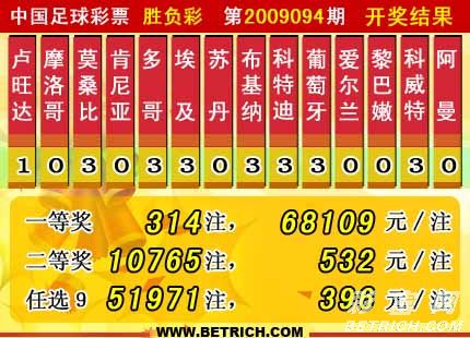 �����й������Ʊʤ���ʵ�09094�ڿ���������һ�Ƚ�314ע��ÿע68109Ԫ������25477ԪΪ���ͽ��𡣶��Ƚ�10765ע��ÿע532Ԫ������ʤ����������29880634Ԫ��ʤ����ͷ������800����ѡ9������������һ�Ƚ�51971ע��ÿע396Ԫ������115ԪΪ���ͽ��𡣱����ξ�������22833076Ԫ���ξ�ͷ������600��
