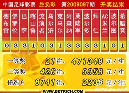 �����й������Ʊʤ���ʵ�09097�ڿ���������һ�Ƚ�21ע��ÿע����471349Ԫ�����Ƚ�426ע��ÿע����9958Ԫ������ʤ����ȫ��������Ϊ22094496Ԫ����ѡ9������������һ�Ƚ�6741ע��ÿע2206Ԫ����������23245426Ԫ��