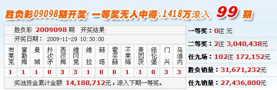 �����й������Ʊʤ����09098�ڿ���������һ�Ƚ������г���14188711.936Ԫ��������ͷ�����أ����Ƚ���2ע��ÿע3040438Ԫ������ʤ����ȫ����������31671232Ԫ��