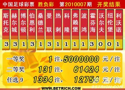 �����й������Ʊʤ���ʵ�10007�ڿ���������һ��1ע500�򣬶��Ƚ�131ע��ÿע61,424Ԫ������ʤ����ȫ��������Ϊ41909178Ԫ��ʤ����10006��12234634.5Ԫ���汾��ͷ�����أ��ƽ�������26,009,946Ԫ��������ͷ�����ء�