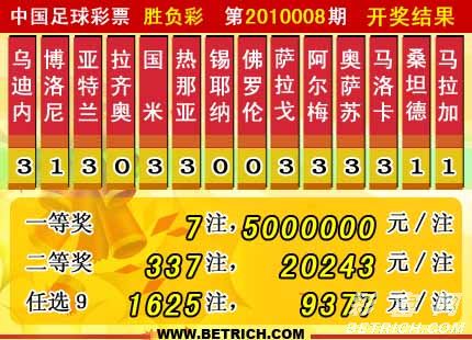 �����й������Ʊʤ���ʵ�10008�ڿ���������һ�Ƚ�7ע��ÿע����5000000Ԫ��6928149.63Ԫ�������ڽ��ء����Ƚ�337ע��ÿע20243Ԫ������14��ʤ����ȫ������Ϊ35531704Ԫ��ʤ����10007��26009946Ԫ���뱾��ͷ�����ء� ��ѡ9������������һ�Ƚ�1625ע��ÿע9377Ԫ��������ѡ�ų�����Ϊ23810628Ԫ��