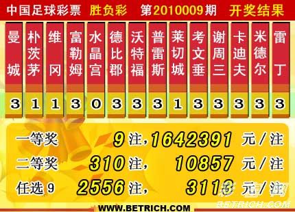 �����й������Ʊʤ���ʵ�10009�ڿ���������һ�Ƚ�9ע��ÿע1642391Ԫ�����Ƚ�310ע��ÿע10857Ԫ������14��ʤ����ȫ������Ϊ17529862Ԫ������6928149.63Ԫ���汾�ڽ��ء��й������Ʊʤ���ʵ�10009����ѡ9������������һ�Ƚ�2556ע��ÿע3113Ԫ��������ѡ�ų�����Ϊ12435876Ԫ��