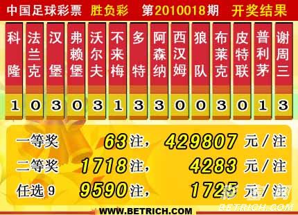 �����й������Ʊʤ����10018�ڿ���������һ�Ƚ�63ע��ÿע429807Ԫ�����Ƚ�1718ע��ÿע4283Ԫ������ʤ����ȫ����������38324328Ԫ����10017��9908583Ԫ���뱾��ͷ�����ء���ѡ9������������һ�Ƚ�9590ע��ÿע1725Ԫ��������ѡ�ų�������38324328Ԫ��
