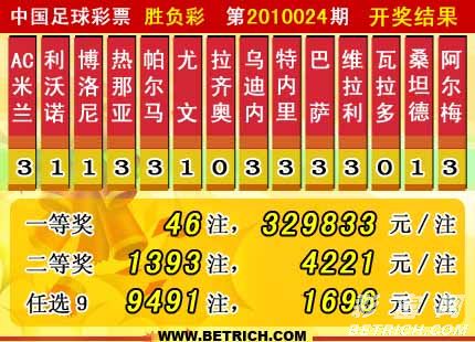 �����й������Ʊʤ���ʵ�10024�ڿ���������һ�Ƚ�46ע��ÿע����329833Ԫ�����Ƚ�1393ע��ÿע4221Ԫ������ʤ����ȫ����������30627756Ԫ������1451116.8Ԫ���뱾��ͷ�����ء���ѡ9������������һ�Ƚ�9491ע��ÿע1696Ԫ��������ѡ�ų�������25152182Ԫ��