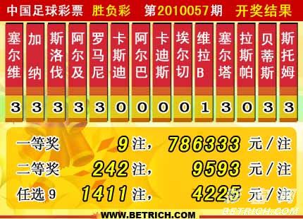�����й������Ʊ��10057�ڿ���������һ�Ƚ�9ע��ÿע786333Ԫ�����Ƚ�242ע��ÿע9593Ԫ����������12091368Ԫ����ѡ9������������һ�Ƚ�1411ע��ÿע4225Ԫ����������9315858Ԫ��