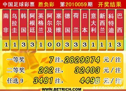 �����й������Ʊ��10059�ڿ���������һ�Ƚ�7ע��ÿע2829874Ԫ�����Ƚ�262ע��ÿע32403Ԫ����������44216782Ԫ����ѡ9������������һ�Ƚ�3481ע��ÿע4498Ԫ���������� 24468002Ԫ��