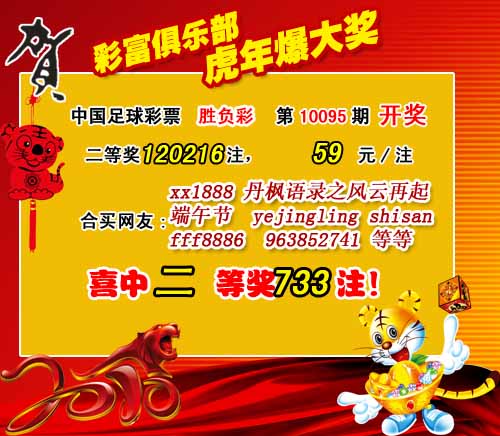 �����й������Ʊ��10095�ڿ���������һ�Ƚ�8138ע��ÿע2049Ԫ�����Ƚ�120216ע��ÿע59Ԫ����������37236234Ԫ��