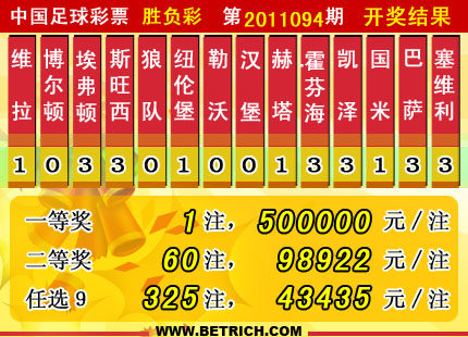 �����й������Ʊ��11094�ڿ���������һ�Ƚ�1 ע��ÿע5000000 Ԫ�����Ƚ� 60 ע��ÿע 98922 Ԫ���������� 30913388 Ԫ����ѡ9������������һ�Ƚ� 325 ע��ÿע 43435 Ԫ���������� 22056860 Ԫ��