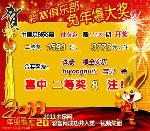 ��������ʱ��12��4�գ�ʤ����11129�ڿ�����һ�Ƚ�58ע��ÿע����241853Ԫ�����Ƚ�1593ע��ÿע����3773Ԫ������ʤ����Ͷע�ܶ�31311362Ԫ����ѡ�ų�ͷ��15691ע1017Ԫ��