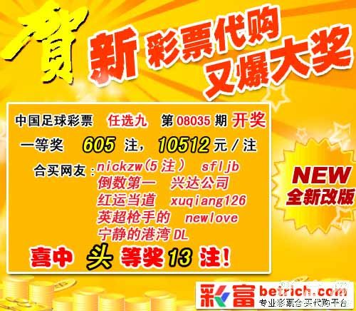 �����й������Ʊʤ���ʵ�08035����ѡ9������������һ�Ƚ�605ע��ÿע10512Ԫ��