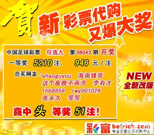 �����й������Ʊʤ���ʵ�08043����ѡ9��������һ�Ƚ�5210ע��ÿע����946Ԫ��