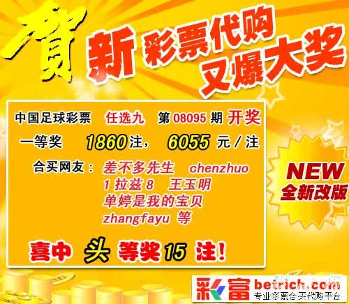 �����й������Ʊʤ���ʵ�08095����ѡ9������������һ�Ƚ�1860ע��ÿע6055Ԫ��������ѡ9��ȫ��������17597656Ԫ��