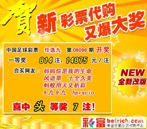 �����й������Ʊʤ���ʵ�08096����ѡ9������������һ�Ƚ�814ע��ÿע14875Ԫ��������ѡ�ų�������Ϊ��18919906Ԫ��