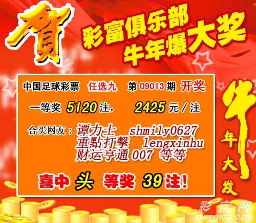 �����й������Ʊʤ���ʵ�09013����ѡ�ų�����������һ�Ƚ�5120ע��ÿע2425Ԫ��������ѡ�ų�������Ϊ��19406664Ԫ��