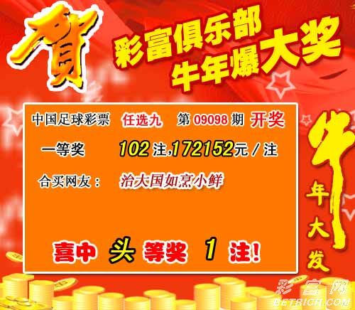 �����й������Ʊʤ����09098����ѡ9������������һ�Ƚ�102ע��ÿע172152Ԫ����������27436800Ԫ��
