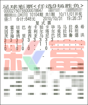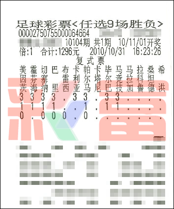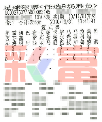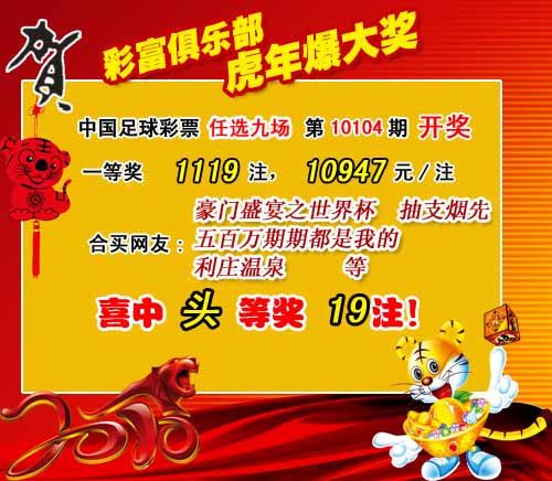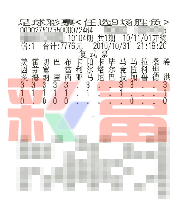 �����й������Ʊʤ���ʵ�10104����ѡ9������������һ�Ƚ�����1119ע��ÿע10947Ԫ��������ѡ9��ȫ��Ͷע�ܶ�Ϊ��19140900Ԫ��