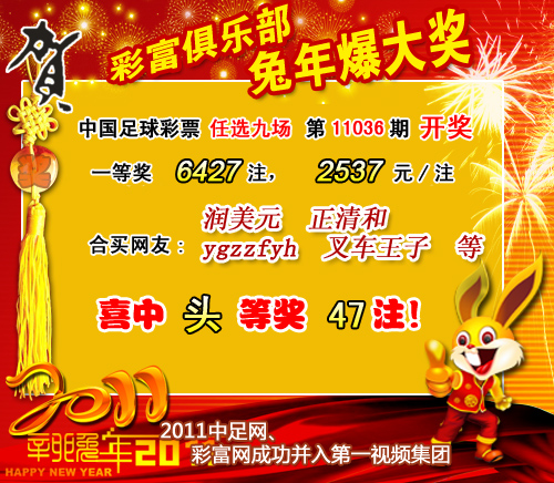 �����й������Ʊʤ���ʵ�11036����ѡ9������������һ�Ƚ�6427ע��ÿע2537Ԫ��������ѡ�ų�������Ϊ��25486712Ԫ��