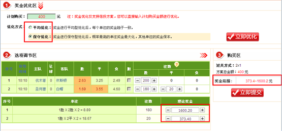 �������������Ż��������ںʹ�Ҽ����ˣ�Ŀǰ��֧��ʤƽ���淨�Ľ����Ż���Ҳ����Щ�û������Ǻ��˽⽱���Ż�������ܣ������Ż��DZ�վ������һ���û�����ͨ���Է���ע�����е������Ӷ�ʵ�ֶԷ�������������Ż��Ĺ��ܡ��û����Ը����Լ�����Ҫ�������Լ��ı�Ͷ��ѡ��������ע�����ڣ��Ӷ����������ķ���Ͷע�ͷ����ر��� �������滹�ǽ��ʵ���������û����õ��˽�������ܣ������Ծ�������ʤƽ���淨Ϊ����Ҳ���������û��������������������һ���������а��գ�����һ����һ�����գ������ǵ��Ļ�´������������������ȫ����ѡ��������û�ף� һ����ѡһ��ȫ�������ر��Ľ����Լ���һ���̶��Ͼ;��������ˡ�����ʹ�ý����Ż������������������Dz��ǿ����Լ���"��"������ͼ��ѡ��2��������һ�� ������ѡ������һ������˫ѡ��100����Ͷ2��1�� �������������Ե��"�����Ż�"��ť���뽱���Ż�ҳ�棬�����ͼ ��������ͼ�����Ż�ҳ���ѿ����������Ա����Ż�Ϊ����������Ǵ���������⣬�����ӯ��1200��Ԫ������һ�Լ�û���յ�һ����ı��䣬�ǻ��ǿ����ջ�300��Ԫ�Ľ�����������̫��Ȼ�������Ը����Լ��ķ������жϣ�����ͨ�����������Ҳ�ĵ��ڰ�ť���е��ڣ�����ʵ�ַ��������Լ���"��"��Ч���� ������������������ϸ����һ��"ƽ�����Ż�"��"�������Ż�"��ԭ��ƽ�����Ż���ֻҪԭʼ�������У����۴�����ֽ�����������һ�£������ĺô���ԭʼ�������۴�����ֽ�����������ջ���Թ̶��Ľ���ر��� ���������Ż���ԭ�����û�Ͷע��ԭʼ���������������ĵ�ע�⣬������ע����ӽ�Ͷע�����������ĵ�ע����ԭʼ�����ܽ����������ﵽ������� ����ƽ���Ż��ͱ����Ż���ʵ�����û�����ʵ�ֿ���Ż���һ�ַ�ʽ��Ϊ�����û����Ը�Ϊ���Ķ��Լ��ķ�����������Ż������ǻ��ṩ���û����е��ڵĹ��ܣ���������"����ѡ��"��"���ڵ�ע"�ķ�ʽ�Է������е������Ӷ�ʵ�ֽ����Ż���Ŀ�ġ� ���������Ż�ҳ���������"ƽ���Ż�"��"�����Ż�"״̬�£�������ͨ�����"+"��"-"�Է������е��ڡ� �������û�����ij��Ͷעѡ��ʱ����ѡ��ļӼ��������Ӧ�Ŀ̶Ƚ��б仯����ѡ��Ŀ̶ȵ��ڸ�ѡ���ڷ����й����ĵ�ע���������ڵ�עʱ�������迼����Ӧ�̶ȣ��ڶԽ����н��мӼ�����ʱ���������ĵ�ע�����ᰴ�ո�ע�ĵ�ע������мӼ��� ���������Ż�ʹ������ �����Ż����� ����Ͷע����