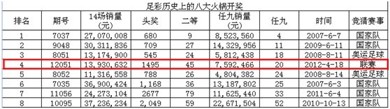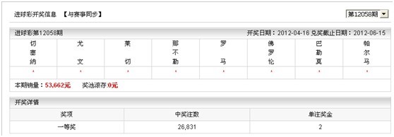 ��������ʱ��4��18�գ�ʤ���ʵ�12051�ڿ������������һ�Ƚ�4,174ע��ÿע����1495Ԫ�����Ƚ�58,355ע��ÿע45Ԫ���ξ�ͷ��236,806ע��ÿע����20Ԫ�����7���������ڰ�310ȫ�Լ��㡣20Ԫ��ѡ��ͷ������ֻ��������ʷ���ĵͣ������֮ǰԤ�Ƶ����Ը���Щ���Ͼ�7������ȫ��Ի��������н�ע����