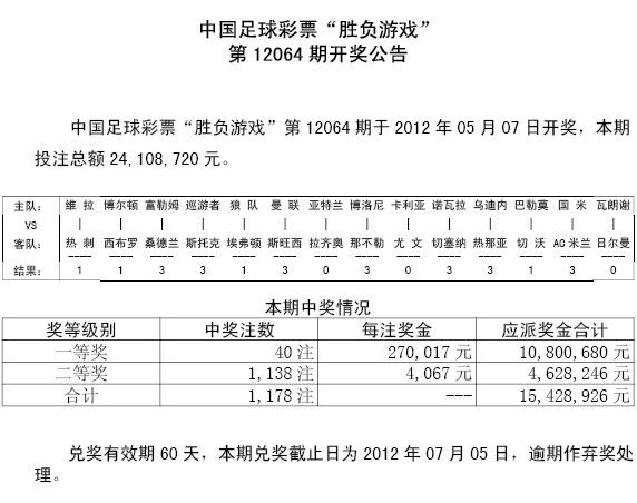 ��������ʱ��5��7�գ�ʤ���ʵ�12064�ڿ������������һ�Ƚ�40ע��ÿע����270017Ԫ�����Ƚ�1138ע��ÿע4067Ԫ������ʤ��������24,108,720Ԫ���ξ�������17,469,826Ԫ��