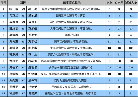 1���� �� VS �� �� �Ƽ���3 ����ϣ����1.10 7.00 13.00 �������ʣ�1.11 7.00 13.00 ��ʤ���� 1.15 6.50 13.00 ��������ȵ������ �������������ڵĽ�18�����·���¼�ò������ƣ��ո���3�³��ڽ������������У������ͳ�2��1���ܵ¹�����������������Ȼ����������������������֣����߳�����1ʤ6����Ψһһ��ȡʤ����������������������·˹�ı������������ͺ��ѱ���Ҽ�������������������Ӵ��ȸ�֡� ���������������� ����ϣ��1.10 7.00 13.00��ʤ���ѹ��ƽ��Ӹߣ������ŷ�����߶ȷ���������ʤ���������0.01����ѹ������ʤ��1.15���ɱ����ڰ�ȫ���䡣�IJ�����������һ�µ�λ��ƽ������̧�ߣ�������ͼ�������������ŷ������ҹ�˾����¶����ѹ����֮�⣬��ʤ�ȵ��� ����������������� ��ʤ�ȵ� ����С��ѡ���Ƽ��� 3 2���ڿ��� VS ��ɳ�� �Ƽ���3 ����ϣ����δ���� �������ʣ�δ���� ��ʤ���� δ���� ��������ȵ������ �ڿ�����ȥ��ʮ����������ս���峡��������ȡ��4ʤ1ƽ�ij�ɫս�������Ǹո���3�³��ͳ���������ɫ�У�Ψһһ��ƽ����������¹��ӵĶԻ�����ӽ��ڱ��ַdz�ǿ�ơ���ɳ���ǽ������½��٣�����ֻ�������³������������������ߡ��ڿ�����ͳ����Զʤ��ɳ���ǣ�����״̬Ҳ���㹻֧�֣���Ȼ�����ӽ��ȵ�Ͷע��֡� ����������������������һ��������̫���ע�������������ڿ�����ע�Ĺ�˾���٣���ʤ��������1.40���ҡ���ʤ���ȵ�Ͷע����£��������������������Ӣ����˾Bet3000����5.00��7.00�ĸ�λƽ�����ʣ������Ų����ģ�������ʤӦ��û��̫������ ����������������� ��ʤ���� ����С��ѡ���Ƽ��� 3 3��ī���� VS ����ʿ �Ƽ���31 ����ϣ����1.50 3.60 5.50 �������ʣ�1.44 3.75 6.00 ��ʤ���� δ���� ��������ȵ������ ���������������С��ڸոս������������У�ī����0��2���ڸ��ױ��ǣ������˴�ǰ����ʤ���ƣ������������ܹ�ȡ��3ʤ2ƽ2�������Ʋ������㡣����ʿ���ڽ������������������Ⱥ����Ų�������ڸ�˹����ӣ��������������Ӳ������¡�ī��������Զʤ����ʿ���ȶ���Ȼ����ī���硣 ���������������� ����ϣ��1.50ʤ��ƫ�ߣ�����ƽ��������������Ψ��ʤ��ѹ�ͣ�����ʤʾ�á��IJʳ������ʤ�������ɣ�ʤ��1.52���������������������ʤ��ѹ�ͣ�����������֮�ϣ�3.70��ƽ���Ծ߷���֮�⡣Coralʤ���1.57��ʤ���쳣���������ƽ�֡� ����������������� ����ƽ�� ����С��ѡ���Ƽ��� 31 4�����ɸ� VS Ī���� �Ƽ���03 ����ϣ����δ���� �������ʣ�2.62 3.30 2.25 ��ʤ���� δ���� ��������ȵ������ �����˹����4ʤ5ƽ2����������������״̬���ѣ��Ⱥ������ɭ��������������֧��ͳ���ţ������������ͱ�ƽ�����������ڸ��ɡ�Ī�����DZ�������ھ������ҽ�������Ҳ�dz�ǿ�ƣ����ֻ�������ķɪ�������ն������ʤ���ƣ�Ŀǰ���ֽ����˹��ķ��˹��1�֣��������ӵڶ����ͱ���Ͷע���ƶ��ԣ�Ī����Ӧ�����ܵ�����Ĺ�ע�� ���������������� �����������ѹ��2.25��bwinά����2.15��λ���Ͼ�����״̬���ѣ�����⸶�������ׯ����˵û���κη��տ��ԡ�ƽ�ֻ��ܵ�һ���̶ȵ����ӣ�������ͦ3.30��Coral3.40��ƽ�Ⲣ����֮�⡣������ƽ��3.30��ʾ�ÿ�ʤ��3.10ʤ����Ȼƫ�ߣ��������ܵ���Һ��ԣ�������������ʤ�� ����������������� ��ʤ�� ����С��ѡ���Ƽ��� 03 5���µ¸� VS ������ �Ƽ���*
