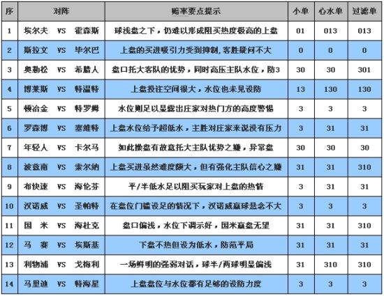 ����ժҪ��12097��ʤ���ʽ�����ŷ�ް����������ִλغϵ����¡��ӱ����̿ڽǶȹ۲죬�жೡ�̿�����dz���������������ء������������ֶ��ǵ��͵��̿�ƫdz���Ҫ�ص�������ŵĿ����ԡ����϶��͡���ұ���Լ�������������ƶ����̿ڷ������ȷdz���λ��ǿ�Ʒ�Ӯ����ȻҲ��������֮�С� ����1 ������ VS ��ɭ˹ �Ƽ���013 ������ �� 1.68 ���� 2.08 ����Bet365 1.65 ���� 2.20 ������ʤ�� 1.65 ���� 2.15 ������Ϊ��䳬������ھ��汾��������ţ�����������ս�ͳ�ս�Ͷ��ֵ�����£��ص�ǿ���������ܸ߿���������ֻ�����Ե����һ֧ǿ�ӣ������������ǽ������ƶ����������γ��յ㣬������Ȼ���γ�һ�ߵ����ȶȡ�����һ���ȶ��������ԵĶ����£�����ׯ�Ҹ��賬��ˮ�⸶�����ڰ���dz��֮�£��������γ������ȶȼ��ߵ����̣�����������Ӯ����ɣ������ص㡣 ����2 ˹���� VS �϶��� �Ƽ���0 ������ �� 1.86 ��һ�� 1.90 ����Bet365 1.875 ��һ�� 1.925 ������ʤ�� 1.75 ��һ�� 2.05 ������Ϊ����������ǿ�ӣ��϶��ͱ�����սŷ�ް�������Ȼ����ҵ�������������������˹������ȣ��϶��͵�����Ҫ�߳��ܶࡣ�غϽ���϶�������3��1��ݣ���Ȼ�λغϲ��ޱ���Ӯ��ı�Ҫ��������������£��϶�������Ͷע�����ŷ����̿ڸ������һ����ˮ��ע�����̵�����������ܵ����ƣ�ׯ�Ҳ�δ�����ռ����������ʽ𣬿�ʤ��Ȼ���ʲ��� ����3 ������ VS ϣ���� �Ƽ���30 ������ �� 1.70 �ܰ��� 2.06 ����Bet365 1.70 �ܰ��� 2.10 ������ʤ�� 1.75 �ܰ��� 2.07 ������������������Ų������������Ų������Ҳ�߱��㹻������������������¼��5ʤ4ƽ�IJ��ܼ�¼�����غ�һ��С���������£��λغϻص��������ܵ��㹻��ע���Ͷ�ϣ����������ŷ�ڴ�����ǿ����ŷ�ڵ���������������սŷ����������ҵ������������غ��Ѿ��ȷ����ȣ��λغ�ƽ�ּ��ɳ��ߵ������£���ʤ��Ȼ�����ܵ��㹻���ӡ��������IJʾ�Ȼ��ͦ���ð���ˮ���̿ڹ����д�Ͷ����������ƣ�ͬʱ��ѹ����ˮλ�����ų���ʵ������ʤ�Ŀ����ԡ� ����4 ����˹ VS ������ �Ƽ���130 ������ �� 1.84 �ܰ�/һ 1.92 ����Bet365 1.85 �ܰ�/һ 1.95 ������ʤ�� 1.83 �ܰ�/һ 1.97 ��������˹���Խݿˣ��ڹ���Ҳ���߱��㹻��������ŷս����Ҳ���dz��ͣ���ӵ�֪�������ޡ����������������Ǻɼ��ţ��ڴ�ʤ�ҳ����ù���ͼ�������غ�����2��0���ɻ�������ռ���Ȼ���������״̬��ռ�����Ƶ������أ����DZ���Ͷע�Ĵ��ȷ���Ȼ�������̿�ֻ������ð�/һ��ע�����ڴ���һ���ķ����������Բ��㣬���̱������㹻��Ͷע�ռ䣬����ׯ�Ҷ�������Ӯ�����IJ����㡣ͬʱˮλ�ձ�ά�����и�ˮ���䣬���̸���������ʮ�㡣 ����5 ��ұ�� VS ����ķ �Ƽ���3 ������ �� 1.68 ���� 2.08 ����Bet365 1.675 ���� 2.15 ������ʤ�� 1.65 ���� 2.15 ������ұ����һ֧�����ڿ����ľ��ã�����һ����֪���ȣ������������ķɪ��˵�����ӵ��������������ơ�����ķɪ��Ų��ǿ�����ݣ��������������ų�����δ��ʤ�̣������������ͳ�����ص��ڱ�����Ҳ��¶���š���ս˫�������Ժͣ��λغ�Ӯ�����������Ȼ����������һ�����������ȶ�ƫ�ߵ�Ͷע�����£�������λ��������λ��ˮλ��������¶��ׯ�Ҷ����ŷ��ĸ߶Ⱦ��衣Ŀǰ����ˮλһ��ͣ���ڳ���ˮ����ʤӦ��ϣ����С�� ����6 ��ɭ�� VS ��ά�� �Ƽ���31 ������ �� 1.68 ��/һ 2.08 ����Bet365 1.725 ��/һ 2.09 ������ʤ�� 1.70 ��/һ 2.10 ������ɭ������Ų������ϯ���ţ����������ķ���Ҳ�dz��ȶ���