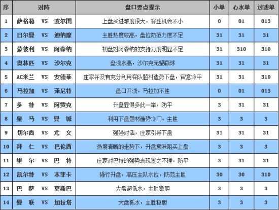 ����ժҪ��12119��ʤ���ʽ�����ŷ��С�����������£����̿ڷ�����������������ƫdz�Ŀͳ�ǿ�Ӱ�ɭ�ɡ�ɳ���˶�Ҫ�������ţ�������һЩ���̱Ƚ��쳣�Ķ���ҲҪ������ƽ�Ŀ����ԣ�����AC�������������ء� ����1 ������ VS ����ͼ �Ƽ���01 �����IJ��̿� 1.88 �ܰ��� 1.98 ������ʤ�� 1.90 �ܰ��� 1.95 ����Bet365 1.95 �ܰ��� 1.975 ���������ղ�����Ħ��������������뱭���Ĺھ���������Ӹ�������ȡ��9ʤ1ƽ��ǿ��ս��������ͼ��ŷս�����������ߣ�����״̬Ҳû�����·硣��������ͼӮ��Ҳ���ܵ�����Ĺ�ע�������Ǵ��ȸ�֡��̿ڼ�ͦ����ͼ�ͳ��ð����ˮ����������ѶȺܴ�����Ͷע�ռ���ر�����С������������ʤ��ϣ��Ӧ����С�� ����2 �ն��� VS ����Ħ �Ƽ���31 �����IJ��̿� 1.86 ��/һ 2.00 ������ʤ�� 1.85 ��/һ 2.00 ����Bet365 1.85 ��/һ 2.75 �����ն����õ��˿��������ŵ�֧����������������ϯ���ߵ�������ǣ����ʵ��ȫ����ߣ�����Ҳֱ�����������Ħ�����������������ڿ����������Ǿ��������ϵ���ĦҲ���ն���֮�£�������ʤ��Ȼ�ܵ�ȫ��߿��������̿ڿ�����/һ1.86��ˮ������ʤ�ȶȽϸߵ�Ͷע�����£���������̵ķ����������Բ��㣬ׯ�ҳ�������ȱ�ڣ������������������ʽ𣬱�����ƽ���ס� ����3 �ɱ��� VS ��ɭ�� �Ƽ���310 �����IJ��̿� 1.92 ��ƽ/�� 1.94 ������ʤ�� 1.70 �ܰ��� 2.15 ����Bet365 1.975 ��ƽ/�� 1.95 �����ɱ��������������������ij������������ǻ����˺������õ��ն�����������ھ���������ͷ�����ּ�³ת������ɭ�ɺ���ӱ�������ʵ������»�����������1ʤ1ƽ3�����ֲ��ѡ���ɭ����������6��1Ѫϴ�ϰ��ն٣����״̬���Ի���������ǹ��������Ȼ�ܵ���ҵĽϸ����ӡ��IJʴӰ�ɭ����ƽ/���ˮ���̣����̶�ɭ�ɵ�֧���������Բ��㣬Ŀǰ��Ȼ������ˮ���䣬����������ռ���ر���Ȼ����������ׯ�Ҷ�ɭ�ɿͳ�Ӯ�����á� ����4 ����ƥ VS ɳ���� �Ƽ���31 �����IJ��̿� 1.93 ƽ�� 1.93 ������ʤ�� 1.95 ƽ�� 1.90 ����Bet365 1.975 ƽ�� 1.95 ����ϣ�������Ű���ƥ�ǿ�˹��������¼��ȫʤս������ӱ�������ͷ�������������������ܵ�������ҵĸ߿���ɳ�����ǵ¼��ã�������ȡ����������������������2ʤ1ƽ����������ȡ�ô�ʤ�����״̬���ѡ�ɳ��������������ĺ��ţ�������ȻԶʤ�ڰ���ƥ�ǿ�˹����������Ҳ���ܵ�������ҵ����ӡ����̿Ͷ�ƽ�ָ�ˮ���IJʶ�ɳ��������δ�ӿ��ã����̺�Ͷӽ�����ˮ��ׯ��ʾ��ɳ���ˣ���ȴ����ɳ������λ������������Ȼ���Ļر����ɴ˿�������ɳ���˿ͳ�����ȡʤ���ᡣ ����5 AC���� VS ������ �Ƽ���31 �����IJ��̿� 1.86 һ�� 2.00 ������ʤ�� 1.85 һ�� 2.00 ����Bet365 1.875 һ�� 2.05 ����AC����ת��������ǰ��������ϯ���ߵȺ����������϶���������Ա�������ӣ���ӱ�����ʵ�������»����������ֺ�AC��������һ��ʤ�̣������������������ɣ�ն���������������������ӣ����״̬���Ը߹�������������������Ȼ��AC�����нϴ��࣬����֧����ʱ����ʵ���������������ӽ�������֮�£����Ӳ��Ǵ���Ͷע��֡�һ���������Ӿ߱�����������Ѷȣ�Ŀǰ����ˮλ���ɱ����ڵ�ˮ���䣬����������ķ��ׯ������ʵ������ʤ��������ı��ʹ�ã���Ŀǰ�̿���̬������ׯ�Ҳ�û�г�����ÿͶ�����������̲��ȣ���ʤ��ȻҲ���������� ����6 ������ VS ������ �Ƽ���01 �����IJ��̿� 1.84 ƽ�� 2.02 ������ʤ�� 1.80 ƽ�� 2.05 ����Bet365 1.85 ƽ�