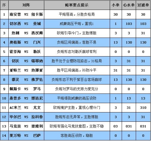 ����12159��ʤ���ʽ�����Ӣ���������������������ӱ���������̬�������ȴ̡����֡�����������DZ��ڲ����ĵ��ĺ�ѡ���������ŵ��ǿͳ���ս�ķ������������ģ�����ŷ������ȷǿ����ͼ��������Ҳ�н�Ũ�����⡣ ����1 �ϰ��� VS Ŧ��˹ �Ƽ���30 ��������ϣ�� 2.30 3.30 3.10 ������������ 2.30 3.40 3.00 ������ʤ�� 2.15 3.40 2.90 ��������ȵ�������ϰ��ն����������ͳ�����Ѳ���ߣ���ǰ2ƽ6�������Ʊ��־ʹ˸��ա��������ϰ��նٽ����˱��ֲ����������ķ���������ӵĺ��ˣ�����ʧ��ﵽ2�����ϡ�Ŧ��˹������״̬���������������������̣��ͳ�ս��Ҳ�൱ƣ��������5���ͳ���δӮ����������Ͷע������Խ��š� ����������������Ŀǰʤ����̬������ӳ��ׯ�Ҷ��ϰ��ն��������ƵĿ϶�������������˾�У�����������ʤ�ⶼ��2.30�ĺ�����λ���IJʡ���ʤ����һ���µ�ʤ�⣬����һ��̧���ĸ�����������֮�¡�ƽ��������ڻ���ʤ��ͼ����ŷ�����̬������������ʤ���ɶ�����˫ѡ30�� �����������������˫ѡ30 ����С��ѡ���Ƽ���30 ����2 �ж��� VS ���� �Ƽ���103 ��������ϣ�� 2.62 3.10 2.80 ������������ 2.62 3.25 2.70 ������ʤ�� 2.45 3.30 2.55 ��������ȵ������ �ж�������������⣬�����ذ�Ҳ�����ֲ��������㣬ȡ����֮���DZ�����˹�����DZ�������Ȼ��ŷ��ս�����ֲ��ѣ�������������Ȼ�������ȶ������ƣ�������������5���ʤά����������ʧ�ָ渺��ŵά������DZ������״ε�����ͷ���λ�á����Ӷ���Ӣ���������ţ��ж�����Ȼ���ֲ��ѣ����Ͼ���������������Ӧ�����ž������ע�ȶȡ� ����������������������̬������ӳ��ׯ�Ҷ��ж����������ƵĿ��͡�����������������ʤ�ϵ���2.62��λ����ʤ���״α���̧����ʤ���IJʱ������ѹ�ͣ���ͦ��λƽ�⣬�˾�����ǿ�տ�ʤ֮�ӡ������µ�ƽ����3.10��λֵ�����ӡ���ʤ�������ƫ����ƽ�ֲ��ǵ�һ��㡣 �����������������ƽ����ѡ ����С��ѡ���Ƽ���10 ����3 �ȴ� VS ����ķ �Ƽ���3 ��������ϣ�� 1.70 3.40 5.50 ������������ 1.57 3.80 6.00 ������ʤ�� 1.60 3.60 5.00 ��������ȵ������ �ȴ̽���������ά�ԡ������밢ɭ�����������ܣ����ֵ±�ս�в���Ѫϴ��������5����������4��������ߵ����������������ս������Ҫԭ������ķ����������Ӣ���Ӳ��ף�������3������1ʤ2ƽ��Ŀǰ����Ӣ�����ߡ���Ȼ������ǿ�������ȴ̵ĵ������ƽ�������ʤ�ȶȣ�ƽ�ֻ��ܵ��ϸߵĹ�ע�� �������������������������1.50ʤ��������1.70��������¶�����ȴ̵Ŀ��ͣ�ƽ���Ѹ�ѹ3.40������ͬʱѹ�͵ĸ�������5.50��λ����ʤ�ѶȽϴ������ߴ�6.00�ĸ�λ����Ҳ�������ŵĿ����ԡ��IJʼ�ͦ3.70ƽ�⣬������������ƽ�������ʤ��ʾ�õ�ƽ��Ҳ������֮�ϡ���������ׯ�Ҹ��п��������������ţ���ʤ�ɲ��� �������������������ʤ���� ����С��ѡ���Ƽ��� 3 ����4 �¸�˹ VS ���� �Ƽ���130 ��������ϣ�� 2.40 3.10 3.10 ������������ 2.38 3.40 2.88 ������ʤ�� 2.25 3.30 2.80 ��������ȵ�������¸�˹�����������ѱ������������Ӳ������⣬12������ս����ӽ���ȡ��1ʤ3ƽ8���ijɼ���������ȫ��ս�ܣ�������ܹ�������11��֮�ࡣ��������ĩ��������˹ͼ���أ���ŷ���������ٶ���ʤ��ݣ�������������Զʤ�ڰ¸�˹�����¸�˹���������ޣ��ͳ���ս��������ظ�����ҿ��á� ����������������Ŀǰ������̬���