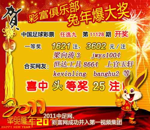 �����й������Ʊ��11128����ѡ9������������һ�Ƚ�1621ע��ÿע3602Ԫ����������9123250Ԫ��
