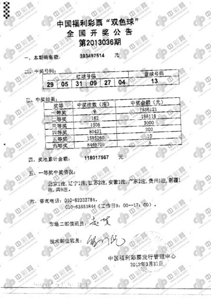 ��������ʱ��2013��03��31�������й�������Ʊ˫ɫ���2013036�ڿ��������ڿ����Ľ���Ϊ������04 05 09 27 29 31 ����13������һ�Ƚ�����9ע��ÿע����ԼΪ753��Ԫ�����Ƚ�����182ע��ÿע����ԼΪ18��Ԫ������Ͷע��ԼΪ3.93��Ԫ���ƽ����������ԼΪ1.18��Ԫ��