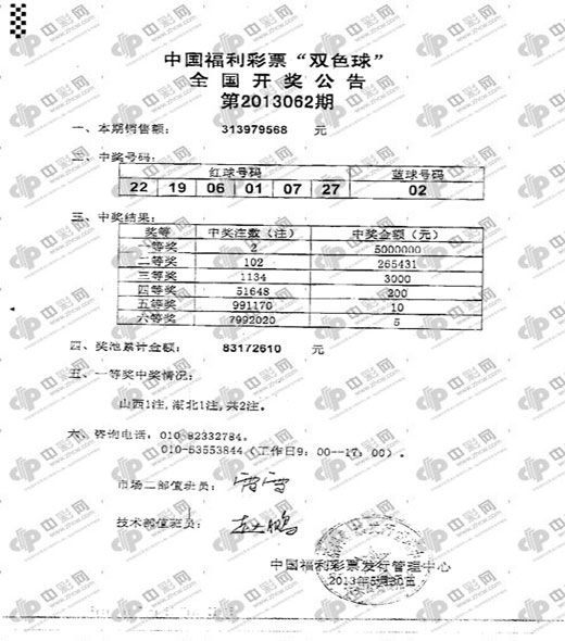 ��������ʱ��2013��05��30������������Ʊ˫ɫ���2013062�ڿ��������ڿ����Ľ���Ϊ������ 01 06 07 19 22 27������ 02��һ�Ƚ�����2ע500��ɽ���ͺ�������ժ�ã����ڽ�����2עͷ���������һ�����µ͡����Ƚ�102ע265431Ԫ��ȫ��Ͷע�ܶ�3.13�ڣ��ƽ���8317�� ��������
