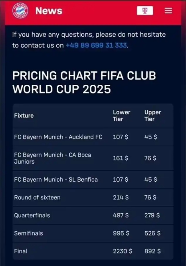 据《每日邮报》报道,以拜仁慕尼黑队为例,他们在小组赛对阵博卡青年的比赛中,下层看台的票价约为161美元(约合127英镑)。而如果对阵本菲卡或奥克兰城,下层看台的票价则略低,为107美元(约合84英镑)。这一价格相较于往届世俱杯或同等规模的国际足球赛事,呈现出了一定的亲民性。