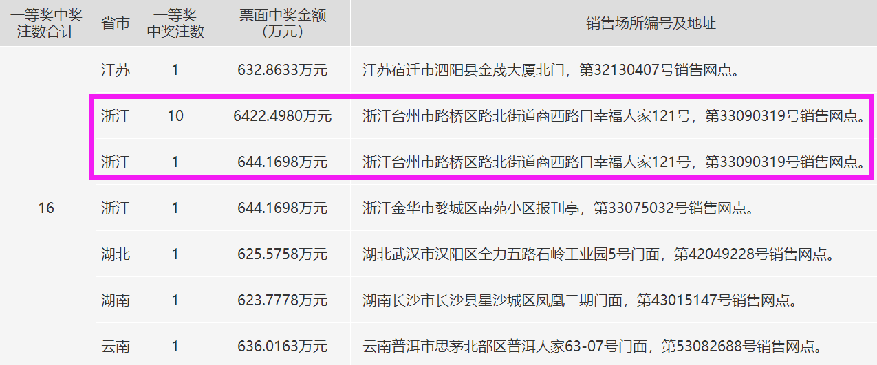 经检索,有11注头奖花落浙江台州市路桥区北街道商西路口幸福人家121号(第33090319号销售网点),其中10注出自同一张彩票,单张彩票收获6422万元;另一张彩票收获644万多元。若两张彩票为同一人所中,则此彩民可收获7066万元巨奖!