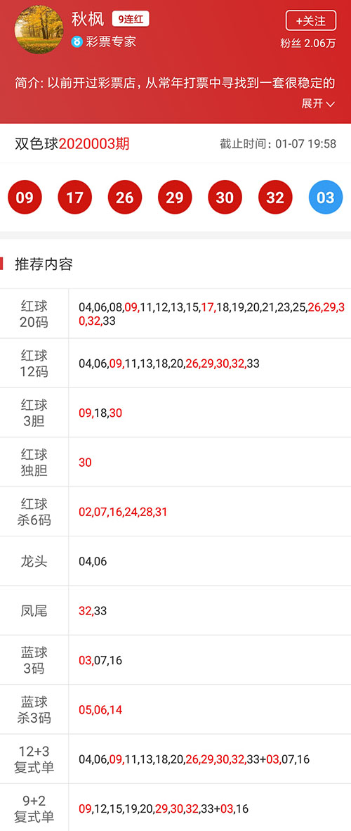 疯狂红单APP【历史战绩】期次可查看推荐详情,双色球最新一期专家推荐(2020004期)已发布,欢迎查看。