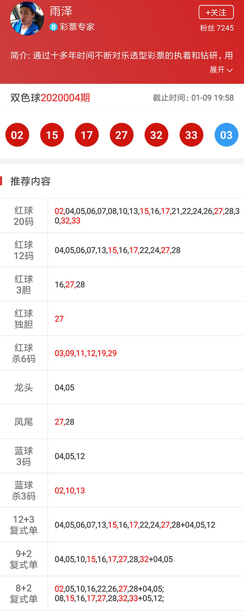 但仍有很多专家保持了较高的推荐水平,雨泽、大李子、帆转乾坤、假行曾、追梦123456、烟雨平生、海创等7天推荐均中6个红球(二等奖)。其中雨泽9+2实战推荐中4+0(五等奖)、8+2实战推荐中5+0(四等奖);大李子推荐12+3复式中5+0、7+2实战推荐中4+0。
