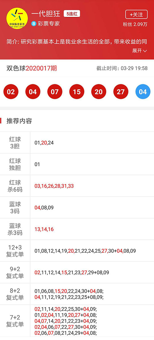 【推荐】:提供双色球、大乐透、3D、排列三专家推荐号码,支持综合、连红、回报、价格等4种方式筛选方案。