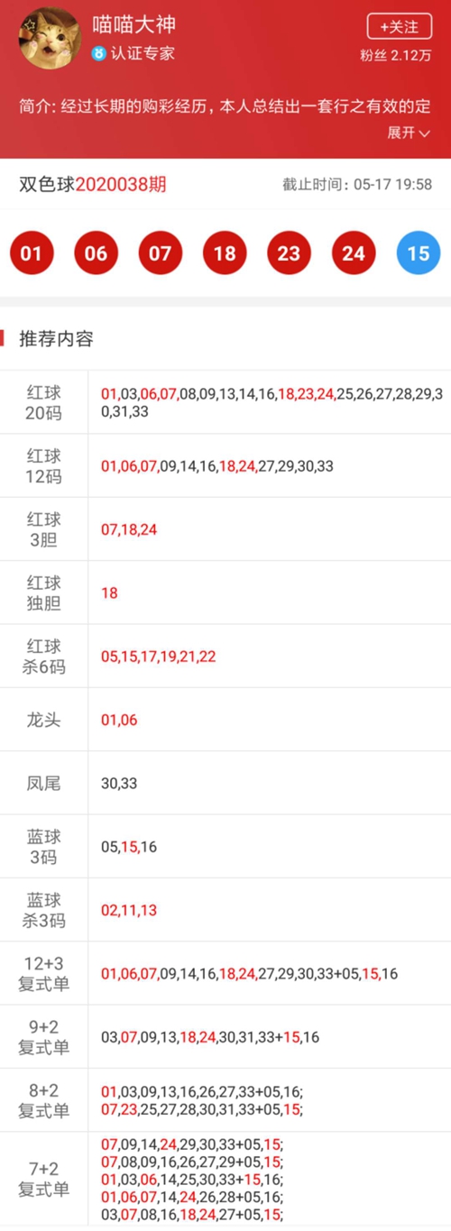本期喵喵大神推荐前区20码中6红,红球12码中5,红球3胆全中,3码中蓝球,大底围号命中一等奖号码。